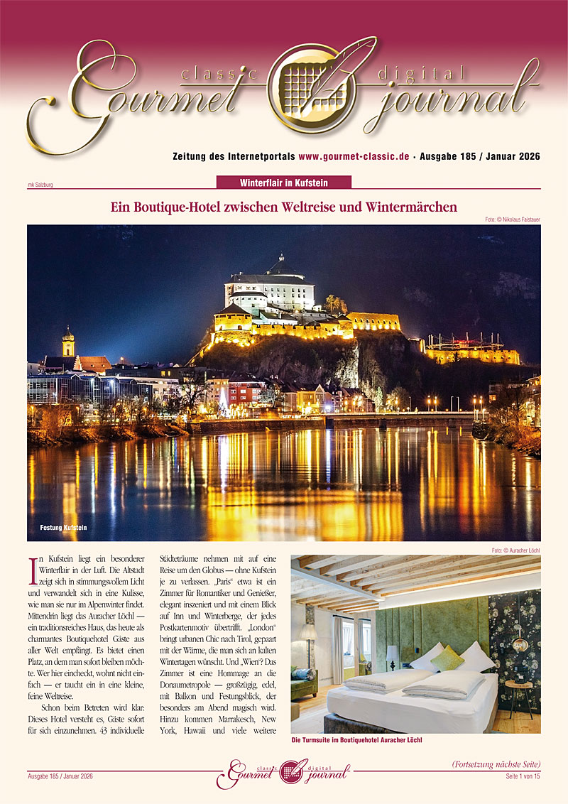 Winterflair in KufsteinEin Boutique-Hotel zwischen Weltreise und Wintermärchen: In Kufstein liegt ein besonderer Winterflair in der Luft. Die Altstadt zeigt sich in stimmungsvollem Licht und verwandelt sich in eine Kulisse, wie man sie nur im Alpenwinter findet. Mittendrin liegt das Auracher Löchl – ein traditionsreiches Haus, das heute als charmantes Boutiquehotel Gäste aus aller Welt empfängt. Es bietet einen Platz, an dem man sofort bleiben möchte. Wer hier eincheckt, wohnt nicht einfach – er taucht ein in eine kleine, feine Weltreise.