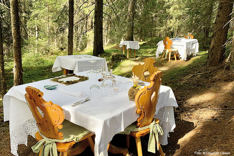 Gourmet-Erlebnis zwischen Tannenwipfeln: Frische Bergluft, weicher Waldboden, Sonnenstrahlen, die durch die Tannenwipfel dringen und ein grandioser Ausblick auf die Bergwelt der Dolomiten – all das ist Luxus, den die Südtiroler Natur gratis für uns bereithält und die besonderen Zutaten für ein einzigartiges Erlebnis, welches alle Sinne anspricht. Die Idee zu einem exklusiven Gourmet-Menü mitten im Wald im oberen Eggental bei Bozen hatte Theodor Falser, der seit 2015 die Küche des Wellness Hotel Engel ****S, einschließlich des Gourmet Restaurants Johannesstube leitet. Diese wurde bereits mit 1 Michelin-Stern ausgezeichnet.