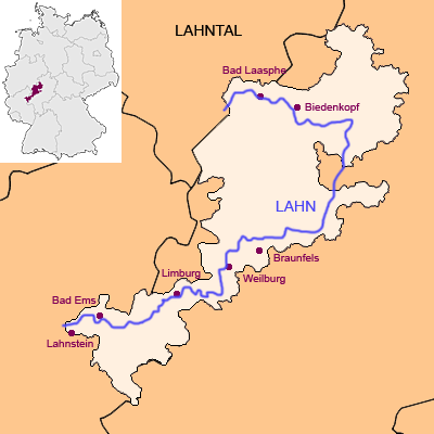 Die Lahn ist ein 245,6 km langer, rechter und östlicher Nebenfluss des Rheins in Deutschland. Sie fließt durch Nordrhein-Westfalen (23,0 km ab der Quelle), Hessen (165,6 km) und Rheinland-Pfalz (57,0 km bis zur Mündung).